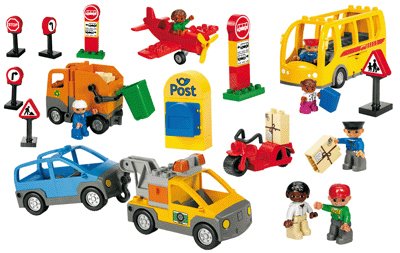 This set allows children to explore a wide range of real-life vehicles, the functions they have in the community and the different roles people have in the community. Includes road signs, waste collection vehicle, airplane, bus, bus stops, DUPLO figures and much more.