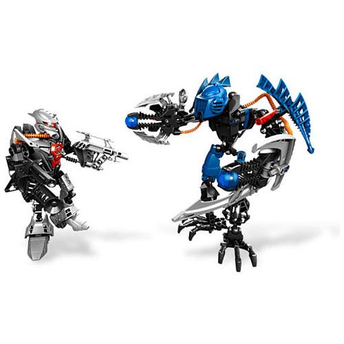 LEGO Bionicle Bulk and Vapour. “Attention Hero Bulk, Vapor has just been spotted causing major mayhem and he must be stopped. Report immediately to the Refitting Room to be mission-equipped with special breathing helmet, jetpack and a special weapon for each arm. Only this special equipment, your strength and experience can withstand Vapor’s dual tube-fed weapons that shoot corrosive vapor!