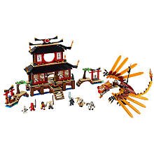 Battle for control of the four Spinjitzu weapons has begun. Sensei Wu, Kai, Zane and Nya need help to keep Lord Garmadon and his evil skeleton army from taking the ultimate Spinjitzu weapon - the Dragon Sword of Fire. As the temple splits into two, the fearsome Fire Dragon emerges to protect the sword by spitting fire at Lord Garmadon. Set also includes Samukai and Kruncha figures, all four golden weapons and 14 other weapons.